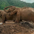 Free at last! Elephants that had been used as slaves for up to 80 years are having the time of their lives after they were freed from their owners in Thailand