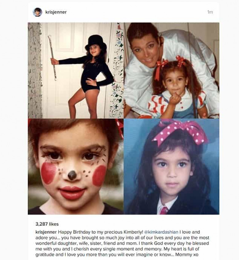 Քրիսը Քիմի մանկության լուսանկարներ էր հրապարակել, որոնցից մի քանիսը դեռ հանրությունը չէր տեսել: Քրիսը գրել էր. «Շնորհավոր իմ թանկագին Քիմբերլիի ծննդյան օրը: Ես սիրում եմ քեզ և հիանում եք քեզանով: Դու մեր կյանքին ուրախություն ես բերել: Դու ամենահրաշալի դուստրն ես, կինը, քույրը, ընկերը և մայրը: Շնորհակալ եմ Աստծուն ամեն օրվա համար, որ անց եմ կացնում քեզ հետ: Իմ սիրտը լի է երախտապարտությամբ: Չես կարող պատկերացնել, թե ինչքան շատ եմ քեզ սիրում...»