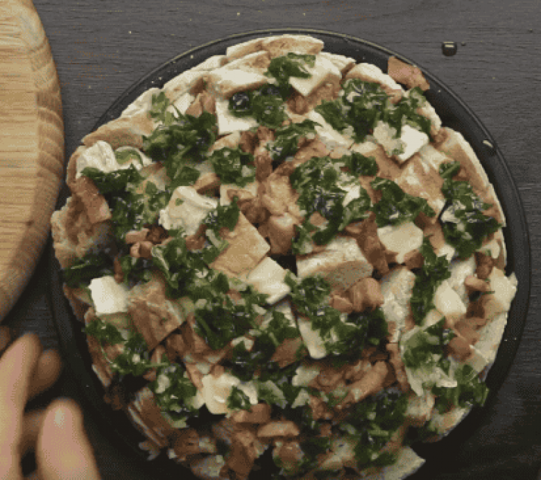 Հացի արանքում շարել պանիրը, բեկոնը, ավելացնել կանաչիով սոուսը ու դնել ջեռոց 180 աստիճանով։