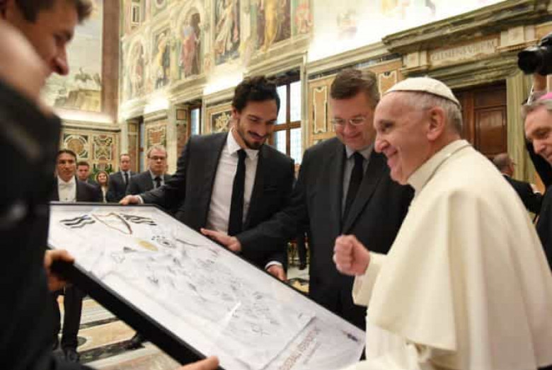 Սան-Մարինոյի դեմ խաղից հետո, որտեղ աշխարհի գործող չեմպիոնները հաղթեցին 8:0 հաշվով, Մունդիալի հաղթողները հանդիպել են Հռոմի Սրբազան հայրապետին: Հանդիպման ընթացքում գերմանացիները Ֆրանցիսկոս Պապրին են նվիրել ազգային թիմի մարզաշապիկը՝ ընտրանու ֆուտբոլիստների ստորագրությամբ: