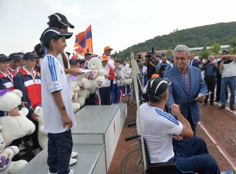 Ամեն անգամ դիմելով ձեզ՝ ես ասում եմ, որ դուք բացի ձեր ընտանեկան մթնոլորտը ավելի հետաքրքիր դարձնելուց, բացի ձեր երեխաներին հոգեպես եւ ֆիզիկապես առողջ դաստիարակելուց, նաեւ մեծ գործ եք կատարում, որովհետեւ դուք ընդօրինակման ենթակա եք ուրիշների համար: Դուք երջանիկ մարդիկ եք, քանի որ համերաշխ ընտանիքներ եք: Առանց համերաշխության, առանց փոխօգնության, առանց ջերմ մթնոլորտի անհնար է մասնակցել այս մասսայական միջոցառմանը։ Ուստի, մեկ անգամ եւս կոչ եմ անում՝ ո՛չ միայն ինքներդ զբաղվեք, այլեւ շատ-շատերին հրավիրեք զբաղվելու, որովհետեւ մասսայական սպորտը միայն առողջություն չէ՝ մասսայական սպորտն ի վիճակի է մթնոլորտ փոխել, մարդկանց տրամադրությունը փոխել։ Բոլորիս կյանքը բաղկացած է մեծ եւ փոքր հաջողություններից, մեծ եւ փոքր հաղթանակներից, անշուշտ, նաեւ մեծ ու փոքր խնդիրներից։ Չկա այս աշխարհում որեւէ մեկը, որ խնդիր չունենա։ Խնդիրները լուծվող են եւ լուծվում են, բայց կյանքը շարունակվում է։ Մաղթում եմ ձեզ եռանդ, մաղթում եմ նոր հաջողություններ։ Դուք չեմպիոններ եք։ Ես շատ ուրախ եմ եւ շնորհակալ, որ հաճույքով մասնակցում եք այս մրցույթներին»,- ողջույնի խոսքում ասել է ՀՀ նախագահ Սերժ Սարգսյանը: