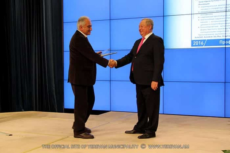 ՀԱՍԱՐԱԿՈՒԹՅՈՒՆՆոյեմբերի 18-ին Մոսկվայում կայացել է Ռուսաստանի Դաշնության նախագծողների և հետազոտողների ազգայի միավորման (NOPRIZ) 2016 թվականի լավագույն նորարական նախագծերի մասնագիտական մրցույթը, որին ներկայացվել էր 188 հայտ: Հեղինակավոր այս մրցույթին մասնակցել է նաև Երևանի քաղաքապետարանի «Երևաննախագիծ» փակ բաժնետիրական ընկերությունը, որը ներկայացրել էր 2015-16թթ. մշակված ուսումնամարզական համալիրի նախագիծը` Երևանի Ավան վարչական շրջանի Ծարավ Աղբյուրի փողոցում: Այս աշխատանքը «Բազմաֆունկցիոնալ համալիրի լավագույն նախագիծ» և «Կրթության ոլորտի օբյեկտի լավագույն նախագիծ» անվանակարգերում արժանացել է առաջին մրցանակների: Մրցանակները և դիպլոմները «Երևաննախագիծ» ՓԲԸ-ի ներկայացուցչին շնորհել է Ռուսաստանի Դաշնության նախագծողների և հետազոտողների ազգային միավորման նախագահ, մրցութային հանձնաժողովի նախագահ, Ռուսաստանի ժողովրդական ճարտարապետ, «Մոսնախագիծ-2» ինստիտուտի տնօրեն Միխայիլ Պոսոխինը: