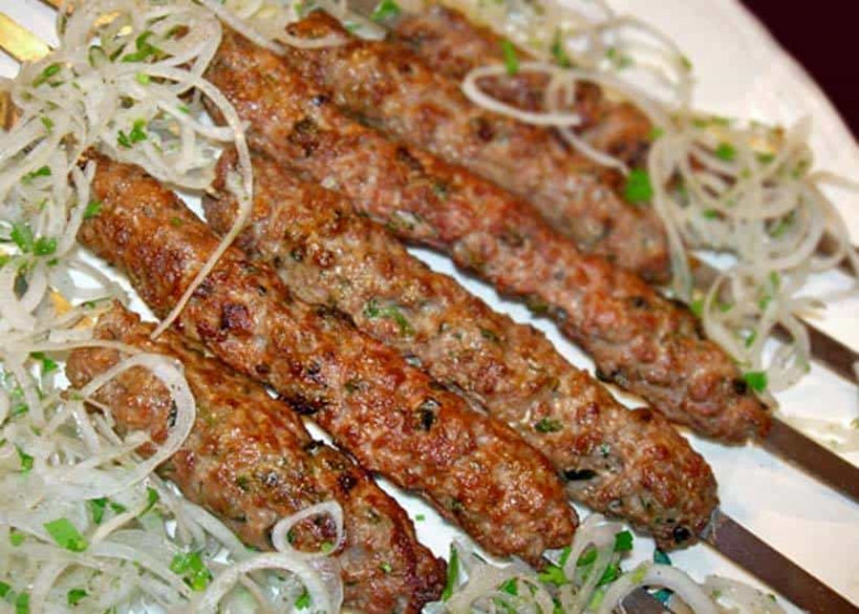Այս ամենը աղալ մսաղացով երկու անգամ, հետո լավ խփել մինչև որ զանգվածը ձգվի, դնել սառնարանում երկուսից երեք ժամ: Այնուհետև կլոր գնդիկներ սարքել և ձեռքերը ջրի մեջ թաթախելով անցկացնել շամփուրի վրա: Հետո դնել թեժ կրակի վրա մինչև կարմրելը: Եթե այն պոկվում է շամփուրի վրայից, անմիջապես շրջեք շամփուրը: Պատրաստի քյաբաբը մատուցեք սոխի և կարագի հետ:
