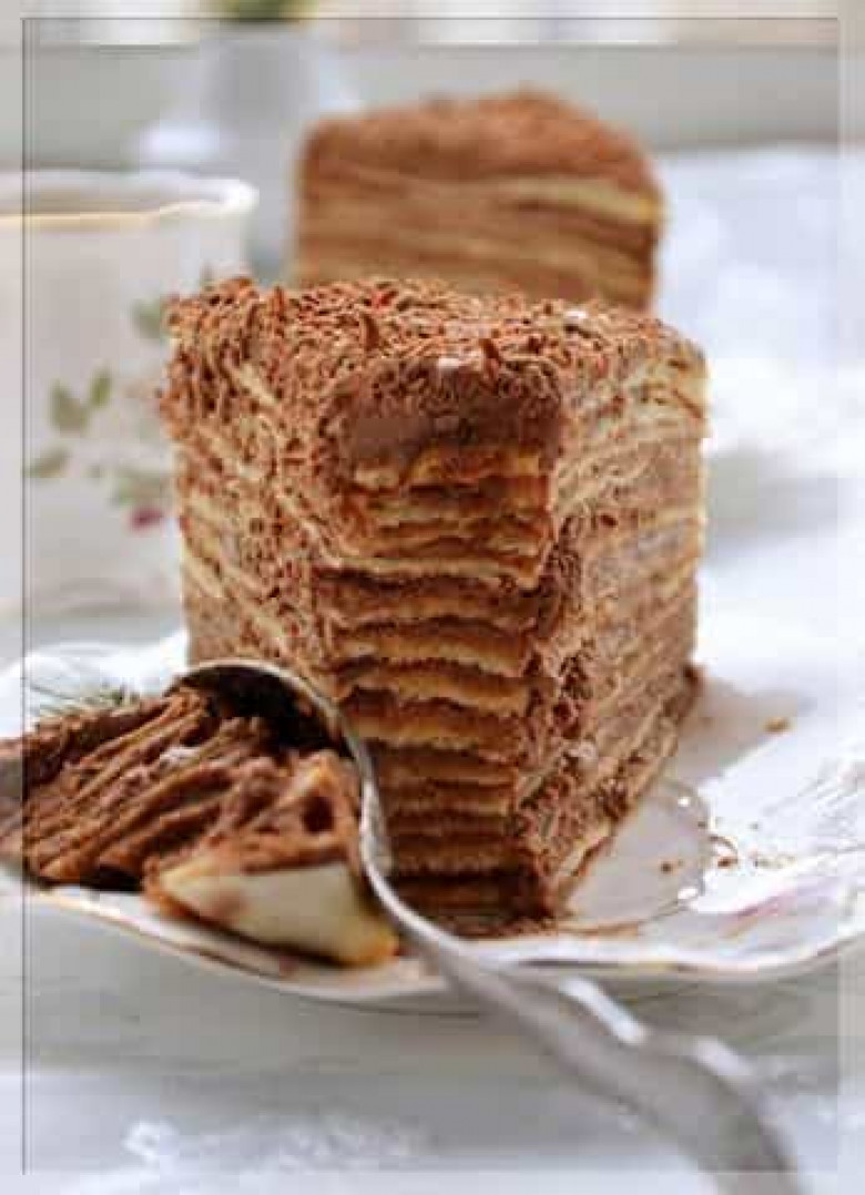 Թողեք սառչեն խմորի շերտերը, եւ միավորեք դրանք կրեմով: Վրան շոկոլադ քերեք: