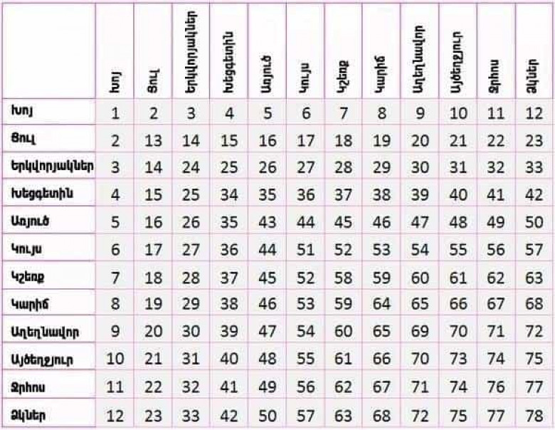 ԼԱՅՖ1. Պայքար, վեճեր 2. Կարճատև հարաբերություններ 3. Հրաշալի զույգ 4. Նրանք ստեղծված են միմյանց համար 5. Կրքոտ հարաբերություններ, երջանիկ զույգ 6. Հավանաբար, ամին ինչ լավ կլինի 7. Հնարավոր է հիասթափություն 8. Հարաբերություններն անկանխատեսելի են 9. Ընկերություն, երջանկություն 10. Երկուսը համառ են, անհայտ է՝ ով հաղթանակ կտանի 11. Անսովոր, իրադարձություններով հարուստ հարաբերություններ 12. Կենսուրախ և երջանիկ հանդիպումներ 13. Լիարժեք փոխըմբռնում 14. Տարբեր խառնվածքներ 15. Զույգերը լավ են հասկանում միմյանց 16. Երկուսն էլ ցանկանում են լինել ուշադրության կենտրոնում, բայց մեկը պետք է զիջի 17. Շատ համառ մի եղեք, և ամեն ինչ լավ կլինի 18. Ամուր հարաբերություններ և բազմաթիվ ընդհանուր գծեր 19. Մեկ րոպե և հրդեհ կբռնկվի 20. Չկա փոխըմբռնում 21. Ամեն ինչ հիասքանչ է և՛ ընկերության, և՛ սիրո մեջ 22. Կարող եք ձանձրացնել միմյանց 23. Երկարատև հարաբերություններ 24. Լիարժեք փոխըմբռնում 25. Անդադար վեճեր 26. Հիասքանչ զույգ 27. Ոչ այդքան համապատասխան զույգ 28. Քնքուշ հարաբերություններ, հաճելի շփում 29. Ուժեղ ձգողականություն միմյանց միջև 30. Սովորեք լսել իրար 31. Միայն հզոր սերը կմիավորի նրանց 32. Բազմաթիվ արկածներ և երջանիկ պահեր 33. Չափազանց տարբեր են երջանիկ լինելու համար 34. Բազմաթիվ դժվարություններ 35. Հնարավոր են հիասքանչ հարաբերություններ 36. Քնքուշ և ջերմ զգացմունքներ 37. Գրեթե չեն հասկանում միմյանց 38. Ամուր միություն 39. Անհաջողություն, ձանձրույթ, գրեթե ոչ մի ընդհանուր գիծ 40. Ցանկանում եք լինել միասին, բայց ավել՝ ոչինչ 41. Վեճեր, վիրավորանքներ 42. Բազմաթիվ երջանիկ օրեր 43. Գեղեցիկ զույգ 44. Մեծ և անդադար վեճեր 45. Հաջող միություն 46. Ամեն ինչ լավ է, բայց վեճերն անխուսափելի են 47. Երջանիկ հարաբերություններ, իրար համար պատրաստ են ամեն ինչի 48. Շատ դժվարություններ, քիչ ռոմանտիկ պահեր 49. Նյարդային և լարված հարաբերություններ 50. Կարճատև հարաբերություններ 51. Լիարժեք փոխըմբռնում, բայց կարող է ձանձրույթ առաջանալ 52. Խուսափեք միանմանությունից 53. Դժվարությունները հաղթահարելուց հետո շատ երջանիկ կլինեք 54. Ավելի լավ է ընդհանրապես հարաբերություններ չսկսեք 55. Որևէ խնդիր չկա, միությունը կատարյալ է 56. Չեք ցանկանում հասկանալ միմյանց 57. Բուռն և կրքոտ սիրավեպ 58. Ջերմ ու բարի հարաբերություններ 59. Բուռն զգացմունքներ և խանդ 60. Ցանկության դեպքում կարող եք հիասքանչ հարաբերություններ կառուցել 61. Միայն ընկերություն 62. Ամեն ինչ լավ է, բայց մեծ շրջապատ է հարկավոր 63. Հույսդ դիր այն անձնավորության վրա, ում սիրում ես 64. Հարաբերությունները լի են դժվարությամբ, բայց երջանկությունը հնարավոր է 65. Ե՛վ սեր, և՛ ընկերություն 66. Շատ տարբեր են դժվար կլինի հասկանալ միմյանց 67. Հարաբերությունները կարճատև են 68. Ձկները կենթարկվեն, բայց երջանիկ կլինեն 69. Խելահեղ սեր 70. Եթե Այծեղջուրը ձանձրալի չլինի՝ ամեն ինչ հիասքանչ կլինի 71. Երկուսն էլ ազատատենչ են, պետք է ավելի շատ ընդհանուր հետաքրքրություններ փնտրել 72. Նման բնավորություններ, սակայն վեճերը նույնպես առկա են 73. Հազվադեպ է ստացվում երջանիկ լինել 74. Ընդհանուր հետաքրքություններ և հոգևոր մտերմություն 75. Եթե սովորեք զիջել իրար՝ երջանիկ զույգ կկազմեք 76. Համակրում եք միմյանց, ուրիշ ոչինչ 77. Շատ ֆանտազիաներ և երազանքներ 78. Հարաբերություններում ձանձրույթ է տիրում