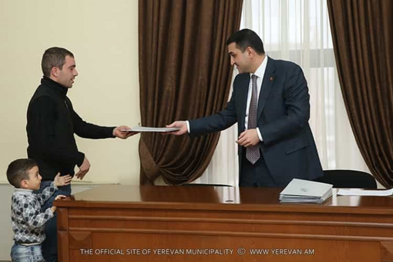 ՀԱՍԱՐԱԿՈՒԹՅՈՒՆԵրևանի քաղաքապետի տեղակալ Վահե Նիկոյանը մայրաքաղաքի Տիգրան Մեծ պողոտայի 47 հասցեի 4-րդ աստիճանի վթարային շենքում բնակվող վերջին 8 ընտանիքին է հանձնել նորակառույց շենքերում բնակարան հատկացնելու մասին Երևանի քաղաքապետի որոշումներն ու բնակարանների բանալիները: