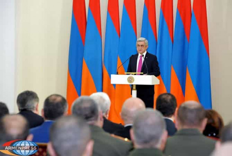 Սերժ Սարգսյանը շնորհավորեց դահլիճում ներկա զինծառայողներին, ովքեր հայկական զինված ուժերում շարունակում են իրենց զոհված մարտական ընկերների նվիրական գործը: «Իմացեք, որ հայրենիքը վստահում և հավատում է ձեզ: Մենք հպարտանում ենք ձեզանով, դուք մեր ժողովրդի արժանավոր զավակներն եք, մեր ժողովրդի ուժն ու ապավենը: Այժմ ձեր ներկայությամբ ես դիմում եմ Հայաստանի ժողովրդին շնորհավորական ուղերձով` հայկական բանակի օրվա կապակցությամբ»,- ընդգծեց ՀՀ նախագահը: