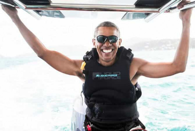 Օբաման Բրենսոնի հետ զբոսանավի վրա հանգստանում Է Մոսկիտո առողջարան-կղզու մերձակայքում եւ նրա հետ մրցում Է քայթբորդի վրա սահելու հմտությամբ: Արդյունքում նախկին նախագահը հաղթել Է միլիարդատիրոջը՝ նրանից առաջ անցնելով 50 մետրով: