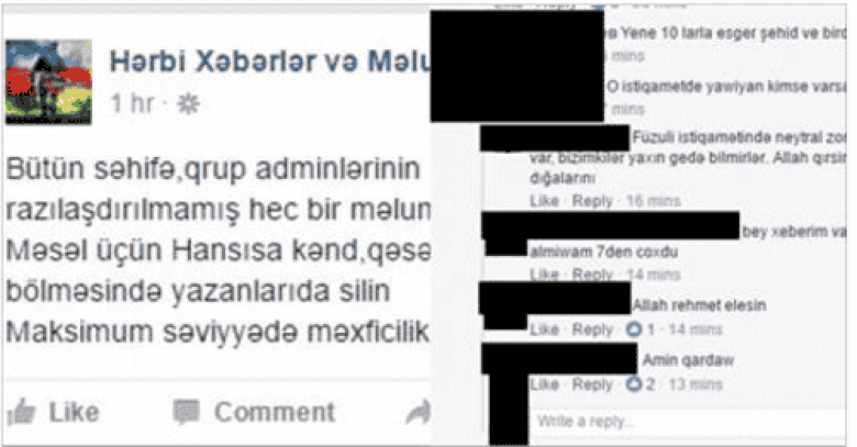 «Խմբի բոլոր անդամներին խնդրում եմ Մեյդան ԹՎ-ի էջում մի ադրբեջանցի գրել է, որ իբր 16 կորուստ ունենք, որից 5-ը՝ սպա։ Այդ մեկնաբանության համար բողոքեք, հայերը սքրինշոթ կանեն ու կտարածեն իրենց կայքերում»
