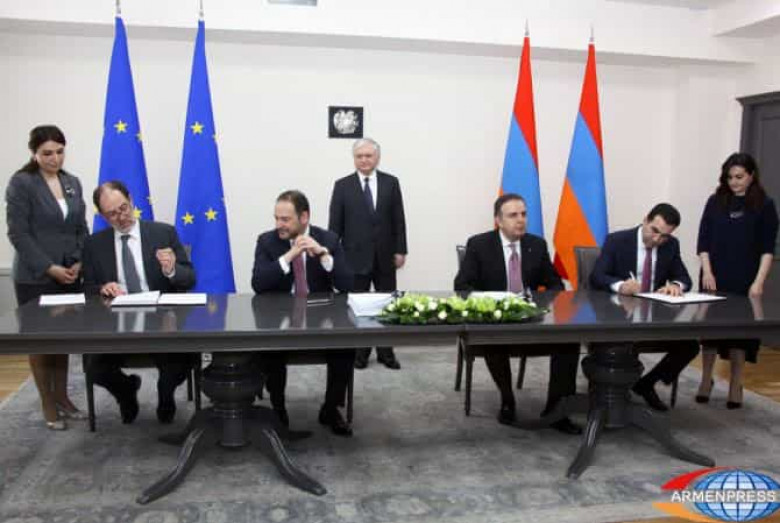 «Մարտի 21-ին Երևանում` Արտաքին գործերի նախարարությունում կայացած արարողությանը, Հայաստանի Հանրապետության անունից գլխավոր բանակցող, արտաքին գործերի նախարարի տեղակալ Կարեն Նազարյանը և առևտրի հարցերով բանակցող, տնտեսական զարգացման և ներդրումների նախարարի առաջին տեղակալ Գարեգին Մելքոնյանը և Եվրոպական միության անունից գլխավոր բանակցող, Արտաքին գործողությունների եվրոպական ծառայության գործադիր տնօրենի տեղակալ Լյուք Դևինը և առևտրի հարցերով բանակցող, Եվրոպական հանձնաժողովում բաժնի ղեկավար Պետրոս Սուրմելիսը նախաստորագրեցին Հայաստան-ԵՄ Համապարփակ և ընդլայնված գործընկերության համաձայնագիրը (ՀԸԳՀ):