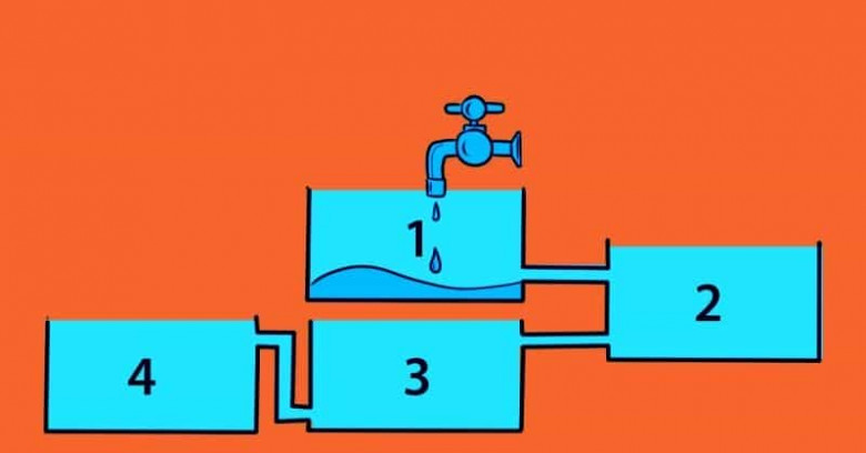 Կա 4 տարա, որոնք իրար են միացված խողովակներով: Առաջին տարայի մեջ ջուր է լցվում ծորակից: Պետք է պատասխանել այս 3 հասարակ հարցին.