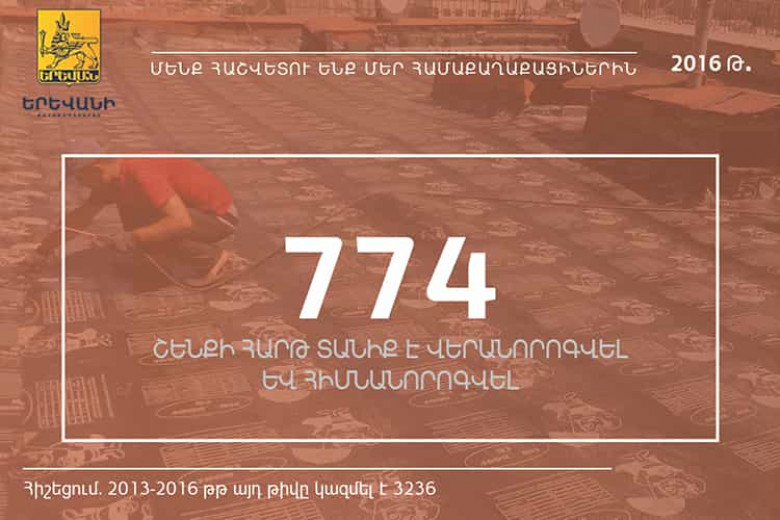 2016 թվականին վերանորոգվել ու հիմնանորոգվել է 774 շենքի հարթ և 1123 շենքի թեք տանիք: Երևան քաղաքի զարգացման քառամյա ծրագրի շրջանակում 2013-2016թթ. վերանորոգվել ու հիմնանորոգվել է 3236 շենքի հարթ և 3766 շենքի թեք տանիք:
