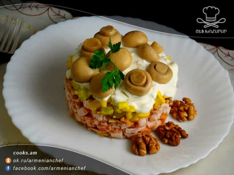Եգիպտացորենի աղցան հավի մսով և սնկով