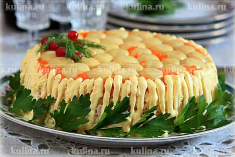 Հավի միսը, կարտոֆիլը, գազարը խաշել: Կտրատել: Շերտերով շարել՝ ավելացնելով մայոնեզ: