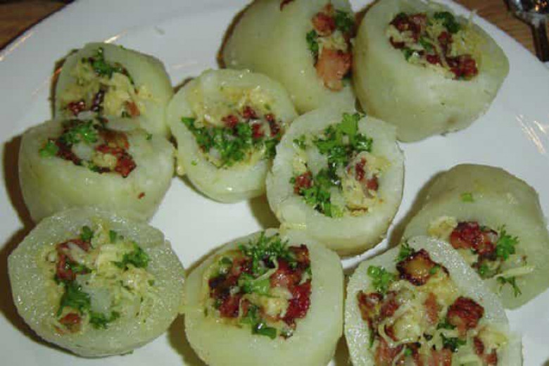 Կարտոֆիլի միջուկը պետք է տրորել և ավելացնել կտրատված կանաչիով, տապակած խոզապուխտով և քերած պանրով խառնուրդին։