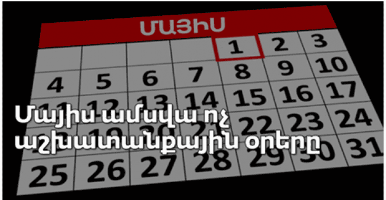 Ոչ աշխատանքային է մայիսի 1-ը, որը երկուշաբթի է: Մայիսի 9-ին նշվող Եռատոնի օրվանից բացի՝ ոչ աշխատանքային կլինի նաեւ նախորդ օրը` մայիսի 8-ը, որը երկուշաբթի է: Դրա փոխարեն աշխատանքային կլինի մայիսի 20-ը՝ շաբաթ օրը։