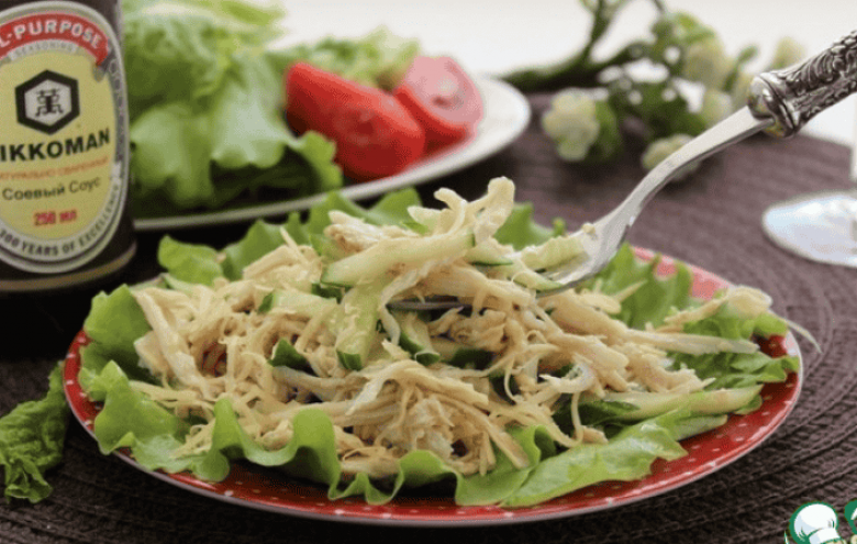 2 թեյի գդալ սոյայի սոուս 1 թեյի գդալ կիտրոնի հյութ Բուսայուղ Հազար Աղ Պատրաստման եղանակ՝ Միսը խաշել (կամ տապակել), վարունգն ու միսը կտրատել։