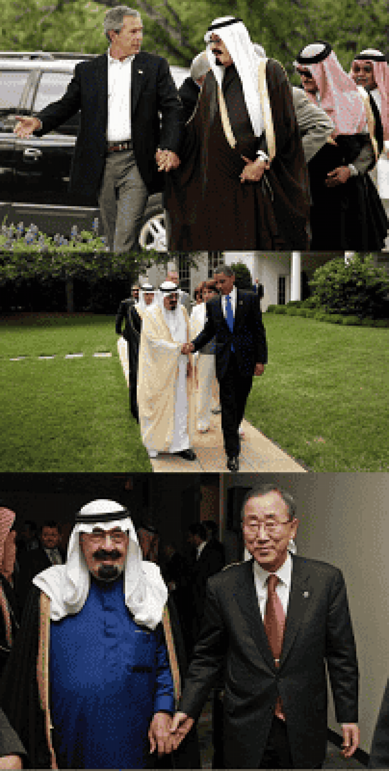 2 Ինչպես երևում է, Սաուդիան Արաբիայի արքա Աբդուլան ձեռք բռնել շատ է սիրում։ Համացանցում բացի այս նկարներից կարելի նաև այլ լուսանկարներ գտնել, որտեղ նա ինչ-որ մեկի ձեռքը բռնած է, իսկ նրա դեմքին մշտապես երեխայական ուրախ ժպիտ։