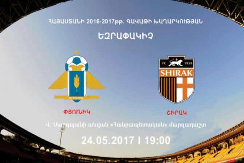 «Արմենպրես»-ի հաղորդմամբ` Երևանի Վազգեն Սարգսյանի անվան «Հանրապետական» մարզադաշտում մայիսի 24-ին տեղի կունենա Հայաստանի գավաթի 2016/2017 թթ. խաղարկության եզրափակիչ հանդիպումը «Փյունիկ»-ի և «Շիրակ»-ի միջև: Հանդիպումը կսպասարկի մրցավարական անձնակազմը՝ Զավեն Հովհաննիսյանի գլխավորությամբ: Մրցավարի օգնականներն են Ատոմ Սևգուլյանը և Արման Ղուշչյանը, մրցավարի լրացուցիչ օգնականներն են Էրիկ Գալստյանը և Արտակ Սիմոնյանը, չորրորդ պաշտոնյան է Արթուր Գդլյանը: Հանդիպման տեսուչն է Սլավիկ Ղազարյ անը: