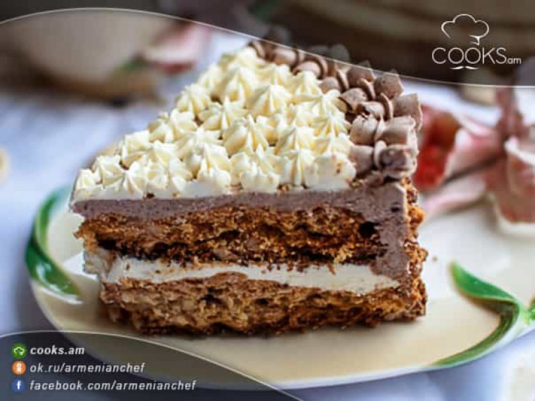 Խմորը 2 մասի ենք բաժանում և լցնում 2 յուղաթղթապատ ձևամանների մեջ Թխում ենք նախօրոք 150 աստիճան տաքացրած ջեռոցում 2 ժամ: Պատրաստի շերտերը 12 ժամ հանգիստ ենք թողնում: