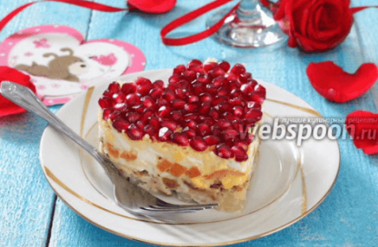 Սրտաձև ամանի մեջ առաջին շերտով լցնել կարտոֆիլ, միս, ընկույզ, ձու, գազար, պանիր, մայոնեզ, նուռ:
