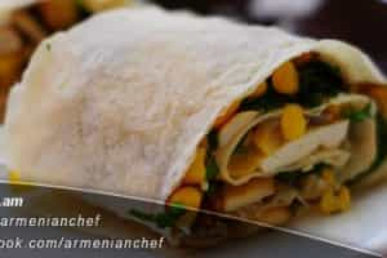 - Եգիպտացորենի ջուրը թափում ենք։ Մաղադանոսը կտրատում ենք։ Եթե լավաշը ուղղանկյունաձև է և մեծ, ապա 2 մասի ենք բաժանում, եթե ոչ թողնում ենք այնպես, ինչպես կա։ Շերտերով կտրատած պանիրը շարում ենք լավաշի վրա,(բոլոր մթերքները լավաշի չափով առանձնացնում ենք, որպեսզի բավականացնի) մի քիչ աղ ենք անում և պանրի վրա ենք դնում սոխով տապակած սունկը։