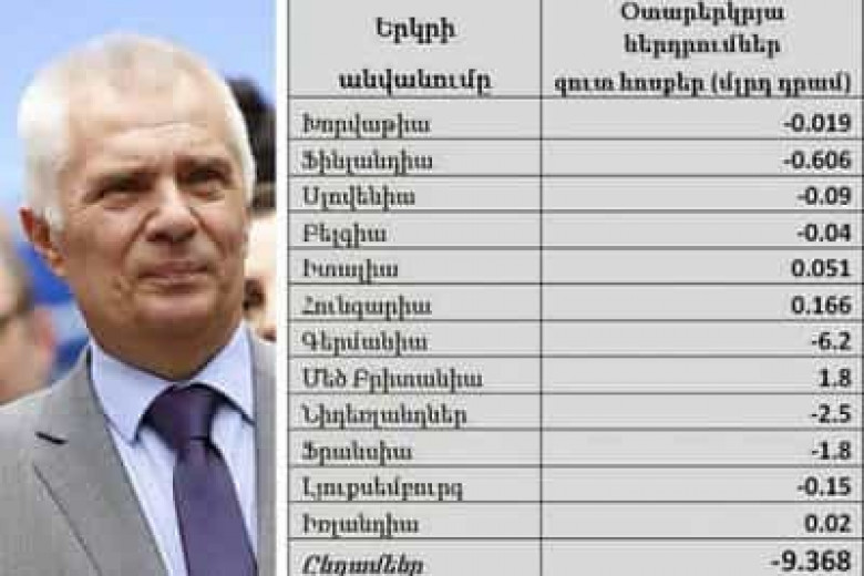 Իսկ ՀՀ ազգային վիճակագրական ծառայության հրապարակած պաշտոնական տվյալներով, այս տարվա առաջին եռամսյակում Եվրամիության երկրներից ՀՀ տնտեսության մեջ իրականացված օտարերկրյա ներդրումների զուտ ներհոսքը եղել է բացասական: Այսինքն` պատկերավոր ասած, նախկինում արված ներդրումներից ստացված շահույթների արտահոսք է եղել Հայաստանից: Արտահոսքն էլ գերազանցում է 9 միլիարդ դրամը:
