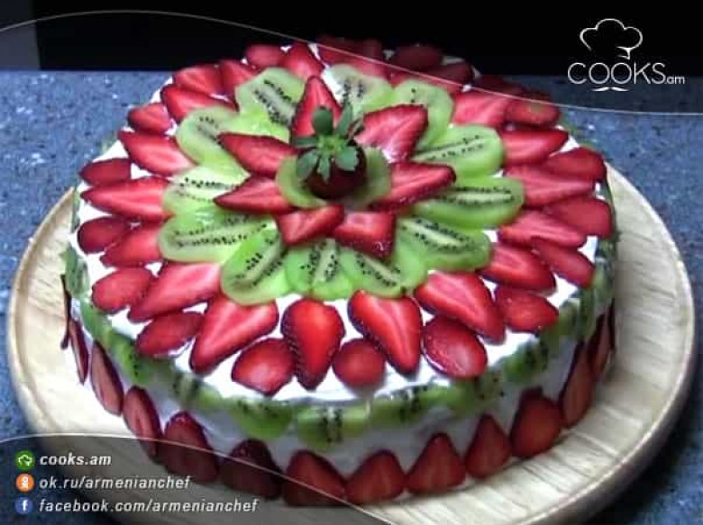 - 300 գր կիվին և 300 գր ելակը գեղեցիկ կտրատում ենք և զարդարում տորթը: