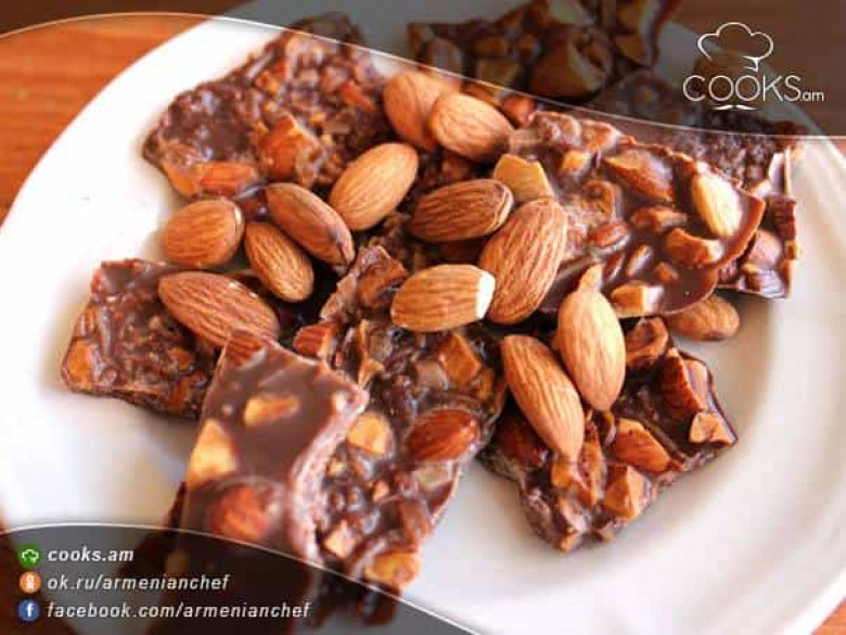Թավան հանում ենք կրակի վրայից և հովացնում՝ հասցնելով 30-40 աստիճանի: Կոկոսի քերուկը, նուշն ու հնդկական ընկույզը մանրացնում ենք, մեր ցանկացած չափի հասցնում, լցնում ենք շոկոլադի մեջ և խառնում: