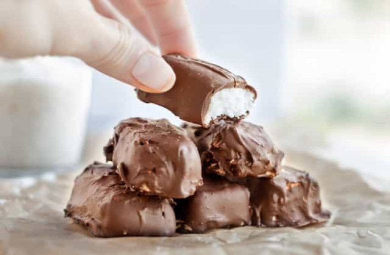 6. Բատոնները հանել սառցարանից: Թաթախել հալեցրած շոկոլադի մեջ և 2 պատառաքաղով դնել թղթի վրա: