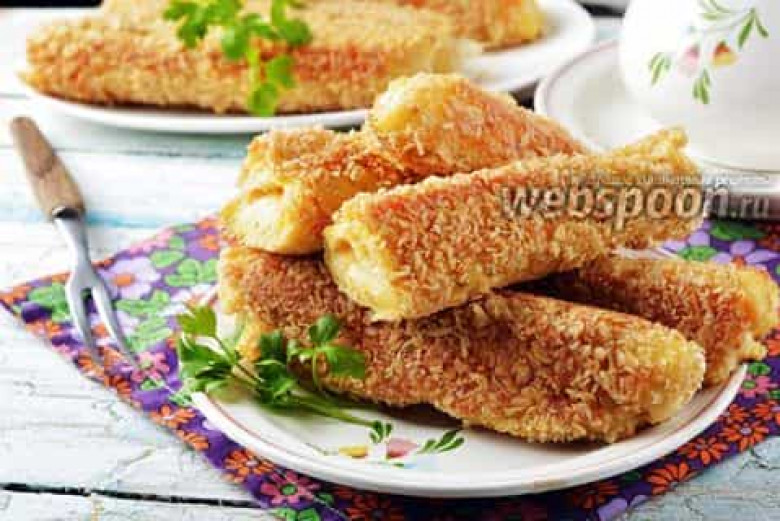 Ձողիկները թաթախել ձվի, ապա փաթիլների մեջ ու բուսայուղով տապակել: