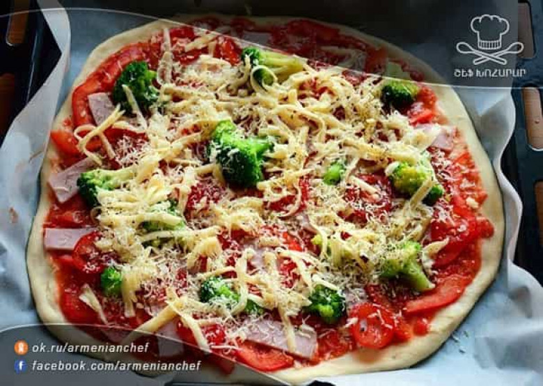 - Պատրաստի խմորը բացել, վրան տարածել լոլիկի սոուսը, ապա տեղադրել միջուկի համար նախատեսված բոլոր բաղադրիչները՝ բացառությամբ ռեհանի և լորի ձվի: