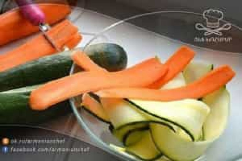 - Կտրատում ենք հավասարապես բարակ շերտերով գազարը և դդմիկը: