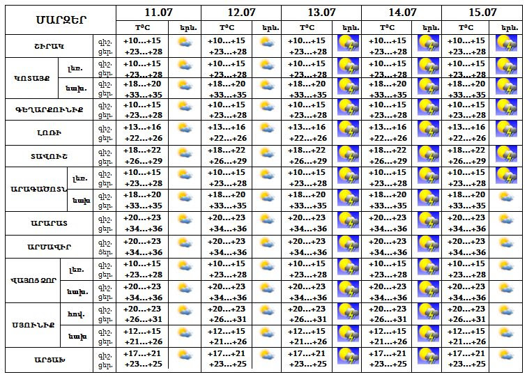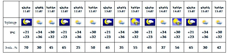 Երևան քաղաքում հուլիսի 11-12-ը, 15-ին սպասվում է առանց տեղումների եղանակ, 13-14-ի երեկոյան ժամերին քաղաքի առանձին հատվածներում սպասվում է կարճատև անձրև և ամպրոպ, ամպրոպի ժամանակ՝ քամու ուժգնացում՝ 15-18 մ/վ: