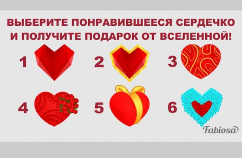 ԼԱՅՖMarketium.ru-ն գրում է, որ սիրտն ուժեղ էներգետիկա ունեցող սիմվոլ է։ Կայքն անսովոր թեստ է առաջարկում. ընտրեք սիրտը, որը ձեզ ամենաշատն է դուր գալիս, և կարդացեք, թե ինչ է նշանակում ընտրությունը։ #1։ Այս սիրտը ձեզ ուրախություն է բերում։ Ձեր խնդիրը միաժամանակ և՛ պարզ է, և՛ բարդ. հարկավոր է ազատվել տխրությունից և անհանգստությունից։ Մի անհանգստացեք։ Եթե հարաբերություններ ունեք որևէ մեկի հետ, դրանք կարող են ավելի ամուր դառնալ։ Եթե դեռ միայնակ եք, շուտով կարող եք գտնել միակին։ #2։ Այս սիմվոլը վկայում է այն մասին, որ մոտ ժամանակներում ձեզ վառ զգացմունքներ են սպասվում։ Պատճառը կարող է լինել նոր ծանոթությունը կամ սիրելիի անակնկալը։ Պատրաստ եղեք, բացեք ձեր սիրտը։ #3։ Եթե ընտրել եք այս սիրտը, նշանակում է՝ կրքերը եռում են։ Մեծ էներգիա ունեք, որը գրավում է հակառակ սեռի ներկայացուցիչներին։ Այդ էներգիան օգտագործեք սեփական նպատակներին հասնելու համար, բայց իմացեք սահմանները։ Այդ դեպքում հաջողությունը երաշխավորված է։ #4։ Այս սիրտն ընտրած կանայք մեծ ու բարի սիրտ ունեն։ Հնարավոր է՝ ժամանակավոր դժվարություններ ունեն։ Մոտ ժամանակներում դրանք կհարթվեն։ Կյանքը նոր գույներ կստանա։ #5։ Այս սրտի ընտրությունը վկայում է այն մասին, որ կյանքում գնահատում եք պարզությունն ու հստակությունը։ Տանել չեք կարողանում ինտրիգները։ Հարգում եք ուժեղ և ուղիղ մարդկանց։ Կյանքի նկատմամբ այսպիսի վերաբերմունքը խոստանում է ներդաշնակություն բոլոր ոլորտներում։ Ամեն ինչ լավ կլինի։ Կարևորը՝ մի դավաճանեք ինքներդ ձեզ։ #6։ Այս սիրտը ձեզ դեպի դրականը փոփոխություններ կբերի։ Համբերեք։ Ճակատագիրը սիրում է համբերատար մարդկանց, ովքեր չեն հանձնվում։