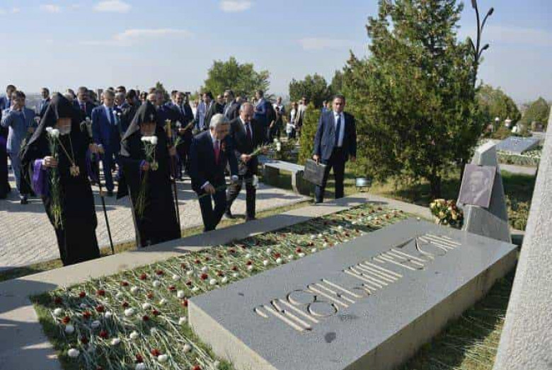 Քաղաքական և հոգևոր առաջնորդները ծաղիկներ դրեցին Վազգեն Սարգսյանի և Անդրանիկ Օզանյանի շիրիմներին, այնուհետ Պատվո պահակախմբի ուղեկցությամբ ՀՀ Նախագահը ծաղկեպսակ դրեց արցախյան հերոսամարտի զոհերի հիշատակը հավերժացնող հուշարձանին: