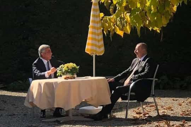 ՔԱՂԱՔԱԿԱՆԺնեւում բանակցությունների ավարտից հետո Սերժ Սարգսյանի և Իլհամ Ալիևի առանձնազրույցից կուսանկար է հրապարակել ՀՀ նախագահի մամուլի քարտուղար Վլադիմիր Հակոբյանը: Սերժ Սարգսյանն ու Ալիեւը ծառի տակ նստած բարձր տրամադրությամբ զրուցում են: Նրանք բավական բարձր տրամադրություն են ունեցել նաեւ բանակցության մեկնարկին: