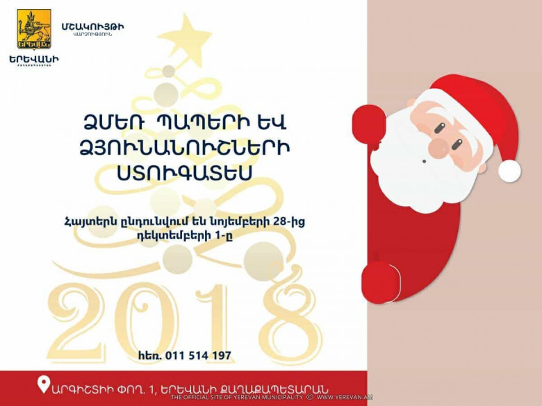 ՀԱՍԱՐԱԿՈՒԹՅՈՒՆ«Նոր Տարին Երևանում 2018» միջոցառումների ծրագրին ընդառաջ՝ Երևանի քաղաքապետարանի աշխատակազմի մշակույթի վարչությունը հայտարարում է Ձմեռ Պապերի, Ձյունանուշների և հեքիաթների հերոսների ստուգատես, որի շրջանակում Նոր տարվա և Սուրբ ծննդյան տոներին Հանրապետության և Ազատության հրապարակների տոնական միջոցառումներին մասնակցելու և գործունեություն իրականացնելու նպատակով կազմակերպություններին և անհատներին առաջարկվում է արտոնագրվել։