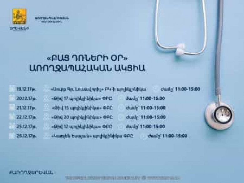 ս.թ. դեկտեմբերի 19-ից մինչև դեկտեմբերի 26-ը Երևանի քաղաքապետարանը մայրաքաղաքի առաջատար բժիշկների և Երևան քաղաքի գլխավոր մասնագետների մասնակցությամբ հայտարարում է առողջապահական «Բաց դռների օր» ակցիա: Ակցիայի շրջանակում քաղաքացիները հնարավորություն կունենան հետազոտվելու և ստանալու մասնագիտական խորհրդատվություն հետևյալ մասնագետների կողմից՝ վիրաբույժ, ուռոլոգ, գաստրոէնտերոլոգ, գինեկոլոգ, քիթ-կոկորդ-ականջ նյարդաբան, սրտաբան: Ակցիան կանցկացվի ստորև ներկայացված բուժհաստատություններում՝ հետևյալ ժամանակացույցով.