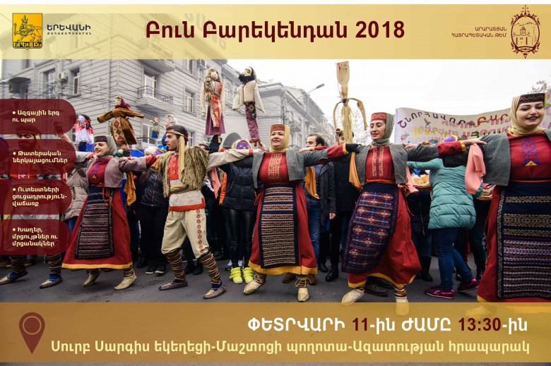 ՀԱՍԱՐԱԿՈՒԹՅՈՒՆՓետրվարի 11-ին ժամը 13:30-ին, բոլորին սիրով հրավիրում ենք մասնակցելու Առաջնորդանիստ Սուրբ Սարգիս եկեղեցուց մեկնարկող Բուն Բարեկենդանի տոնին նվիրված տոնական քայլերթին դեպի Ազատության հրապարակ, որտեղ տեղի կունենան օրվա խորհրդին համապատասխան թեմատիկ միջոցառումներ՝ ազգային երգ ու պար, թատերական ներկայացումներ, ուտեստների ցուցադրություն, խաղեր, մրցույթներ: