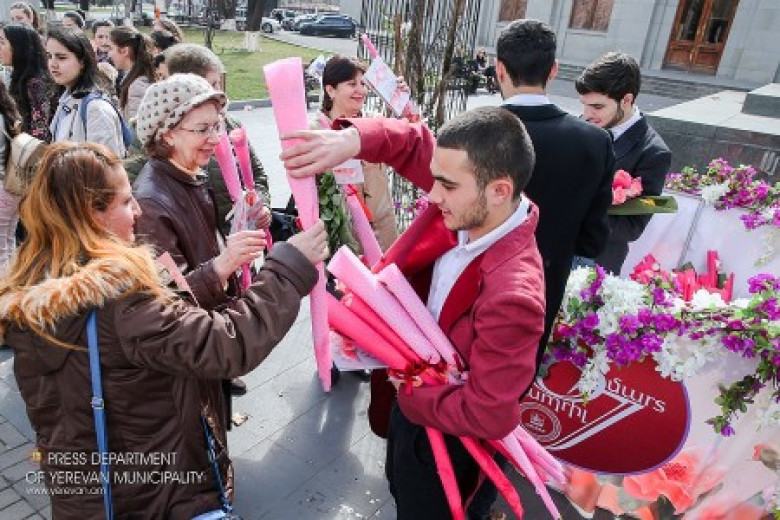 ՀԱՍԱՐԱԿՈՒԹՅՈՒՆԵրևանի քաղաքապետարանի նախաձեռնությամբ վաղ առավոտից մայրաքաղաքի տարբեր հատվածներում կին անցորդների ու հյուրերին դիմավորել են Երևանի քաղաքապետի շնորահավորական բացիկներով և ծաղիկներով: Արամ Խաչատրյանի արձանի հարևանությամբ Երևանի Ա. Տեր-Ղևոնդյանի անվան երաժշտական դպրոցի սաները կանանց ու մայրաքաղաքի մասին երգերի հնչյուններով են լցրել Երևանի տոնական մթնոլորտը: