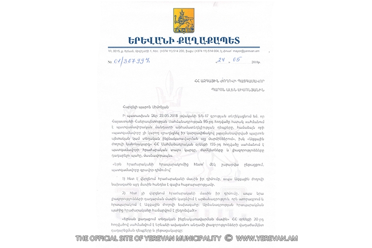 Հուսով եմ քաջածանոթ լինելով այս իրավակարգավորումներին, Դուք նաև տեղյակ եք, որ մեկ շաբաթից ավել միաժամանակ զբաղեցնելով Հայաստանի Հանրապետության Սահմանադրությամբ անհամատեղելի համարվող երկու պաշտոններ, Ձեր ավագանու անդամի լիազորությունները վաղաժամկետ դադարեցվում են օրենքի ուժով, իսկ Երևանի քաղաքապետի կողմից դրա վերաբերյալ արձանագրություն (24.05.2018թ. N4) կազմելն ու ուղարկելը կենտրոնական ընտրական հանձնաժողով ուղղակի պարտավորություն է, իսկ դրա չիրականացնելը օրենքի խախտում: