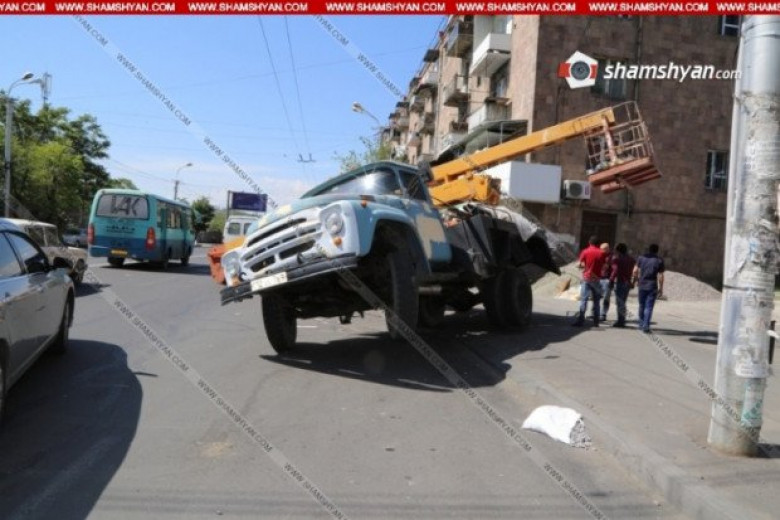 Արտակարգ դեպք Երեւանում. բեռնատարի վրա տեղադրված վերամբարձիչն ընկել է միկրոավտոբուսի վրա (Ֆոտո)