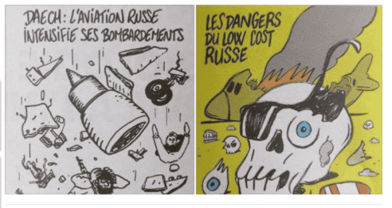 Այս տարվա հունվարի սկզբին Մուհամմադ մարգարեի ծաղրանկարները հրապարակելու պատճառով ահաբեկչական հարձակման ենթարկված ֆրանսիական Charlie Hebdo երգիծական շաբաթաթերթն իր հերթական համարում անդրադարձել է Եգիպտոսի Սինայ թերակղզում ռուսական Когалымавиа ավիաընկերության Airbus А321 ինքնաթիռի վթարին: Մասնավորապես, շաբաթաթերթում հրապարակել է երկու ծաղրանկար ավիավթարի վերաբերյալ, որոնցից առաջինում պատկերված է գլուխը բռնած «Իսլամական պետություն»(ԻՊ) ահաբեկչական կազմակերպության զինյալն, ում վրա երկնքից թափվում են վթարված ինքնաթիռի բեկորները, ուղևորները: Նկարին տրված է հետևյալ խորագիրը՝ ԻՊ.«Ռուսական օդուժն ակտիվացնում է ռմբակոծությունները»: