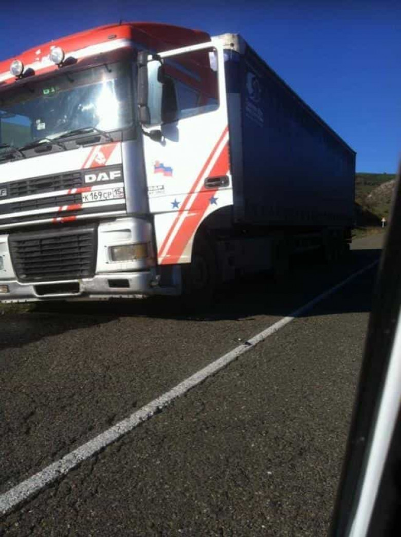 Այս բեռնատարն ընկել է կրակահերթի տակ Բաղանիս գյուղի մոտակայքում: Նկարում երևում է, որ բեռնատարն ունի ռուսական պետհամարանիշներ: Այսինքն՝ ադրբեջանցիները կրակահերթ են բացել ԵԱՀԿ Մինսկի խմբի համանախագահ պետություններից մեկի պետհամարանիշների ուղղությամբ, որի վրա ՌԴ դրոշ կա: Բացի այդ, մեքենայի դռներին էլ են նշմարվում ռուսական դրոշներ: Սրան էլ հավելենք, որ վարորդն ազգությամբ օսեթ է եղել: Փառք Աստծո, չի վնասվել վարորդը, բայց մեքենայի անվադողերը վնասվել են: