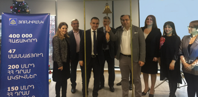 ՀԱՍԱՐԱԿՈՒԹՅՈՒՆՅունիբանկի ԱՄՆ դոլարային պարտատոմսերը ցուցակվեցին ՆԱՍԴԱՔ ՕԷՄԷՔՍ Արմենիայի Abond ցուցակում։ Յունիբանկի 5 միլիոն ԱՄՆ դոլար ընդհանուր ծավալով պարտատոմսերի ցուցակման արարողությանը Յունիբանկի վարչության նախագահ Մեսրոպ Հակոբյանը և ՆԱՍԴԱՔ ՕԷՄԷՔՍ Արմենիայի գլխավոր տնօրեն Հայկ Եգանյանը հնչեցրին ցուցակման զանգը։ Ընդհանուր առմամբ ցուցակվել է 50000 հատ պարտատոմս (UNIBB6) 100 ԱՄՆ դոլար անվանական արժեքով և 5․5% տարեկան եկամտաբերությամբ։ Շրջանառության ժամկետը 36 ամիս է, վճարումները կատարվելու են եռամսյակային պարբերականությամբ։