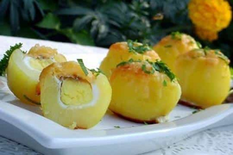 - Կեղևազրկում ենք խաշած կարտոֆիլը, ապա թեյի գդալով հանում ենք կարտոֆիլի միջուկը և ստացված փոսիկի մեջ կոտրում ենք լոիր ձուն: