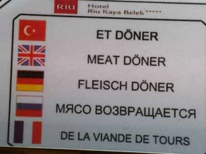Այսպես՝ թռչնամսից պատրաստված ուտեստը թարգմանվել է «միսը վերադառնում է», իսկ բանջարեղենից աղցանը՝ «բուսական ծիածան»։
