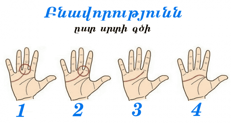 4. Եթե գիծը սկսվում է բթամատի և ցուցամատի միջև, ապա դու համբերատար ու հոգատար ես, ունես փափուկ սիրտ և ուրախ մարդ ես: Քեզ համար գլխավորը հարմոնիան է ամենուր և միշտ: Շատերը քեզ երազող են համարում: