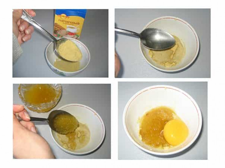 2 ճ.գ. մանանեխի փոշի, 2 ճ.գ. տաք ջուր, 1 ձվի դեղնուց, 2 ճ.գ. մագարիկոնի յուղ (репейное масло) , 2 թ.գ. շաքարավազ, լավ խառնեք, քսեք մազարմատներին, իսկ մազերի ծայրերին քսեք որև է յուղ: Ծածկեք գլուխը պոլիէթիլենային տոպրակով և սրբիչով: Պահել 15-ից 30 րոպե: